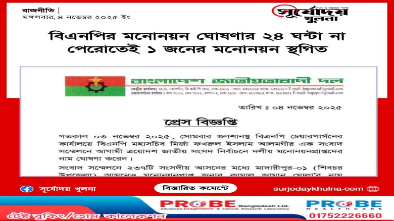 বিএনপির মনোনয়ন ঘোষণার ২৪ ঘন্টা না পেরোতেই ১ জনের মনোনয়ন স্থগিত…