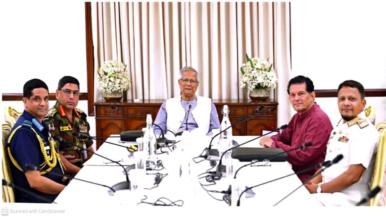 শনিবার সন্ধ্যায় ৭টায় প্রধান উপদেষ্টার রাষ্ট্রীয় বাসভবন যমুনায় সেনাপ্রধান জেনারেল ওয়াকার-উজ-জামান, নৌপ্রধান অ্যাডমিরাল মোহাম্মদ নাজমুল হাসান ও বিমানপ্রধান এয়ার চিফ মার্শাল হাসান মাহমুদ খাঁন প্রধান উপদেষ্টার সঙ্গে এক বৈঠকে এ আলোচনা হয়। বৈঠকে জাতীয় নিরাপত্তা উপদেষ্টা ড. খলিলুর রহমান উপস্থিত ছিলেন।