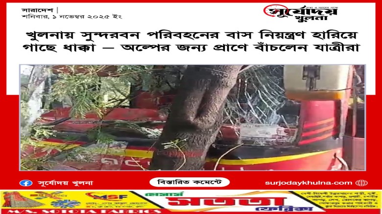 খুলনায় সুন্দরবন পরিবহনের বাস নিয়ন্ত্রণ হারিয়ে গাছে ধাক্কা, অল্পের জন্য বড় দুর্ঘটনা এড়ানো…
